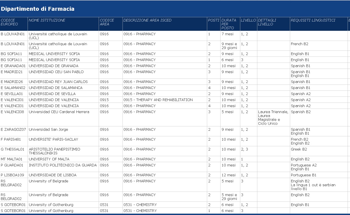 Tale mobilità viene regolata sulla base di accordi bilaterali istituzionali, nei quali sono indicati i posti disponibili, la durata massima di mobilità (in mesi) e i requisiti linguistici richiesti; lo studente iscritto a un CdS afferente al Dipartimento di Farmacia può svolgere il periodo di studio soltanto presso Università con le quali il Dipartimento di Farmacia abbia stipulato accordi. Ad oggi il Dipartimento conta 18 accordi firmati; l’elenco dettagliato è disponibile